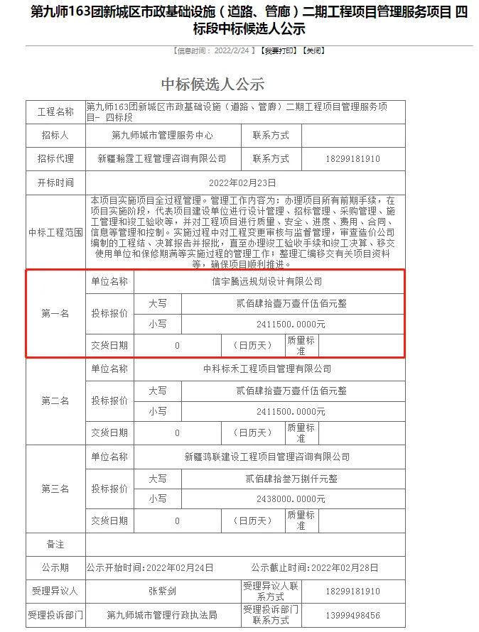 2022年02月,新疆第九師163團新城區市政基礎設施(道路、管廊)二期工程項目進行公開招標,經評審專家綜合評審,采購人確認,確定信宇騰遠規劃設計有限公司中標第九師163團新城區市政基礎設施(道路、管廊)二期工程項目管理服務項目-四標段(全過程管理)。