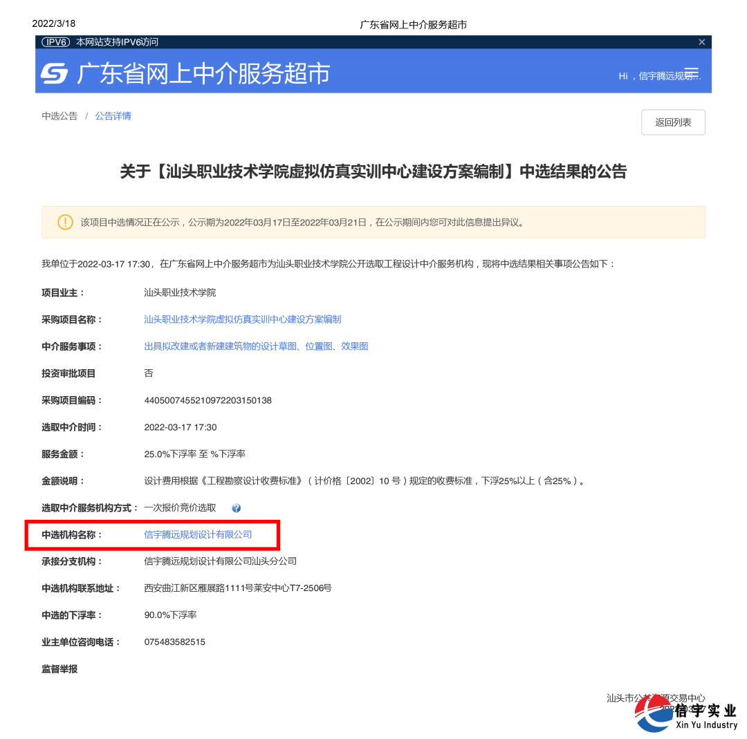 2022年3月,信宇騰遠(yuǎn)規(guī)劃設(shè)計(jì)有限公司通過(guò)廣東省網(wǎng)上中介服務(wù)超市進(jìn)行公開(kāi)選取并經(jīng)過(guò)項(xiàng)目業(yè)主確認(rèn),中選汕頭職業(yè)技術(shù)學(xué)院虛擬仿真實(shí)訓(xùn)中心建設(shè)方案編制。